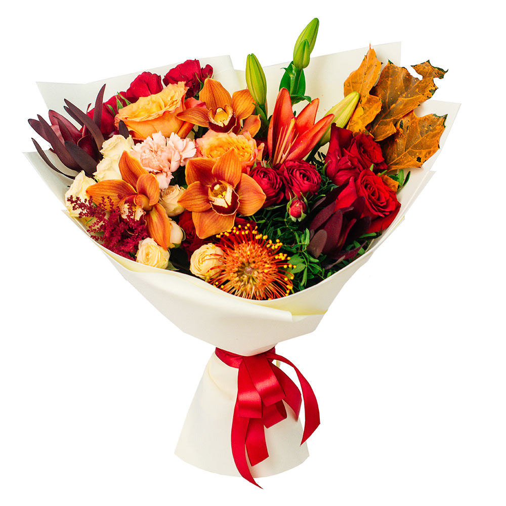 Орхидея, лилия, роза, леукодендрон, леукоспернум, листья клена, гвоздика, роза кустовая, астильба.